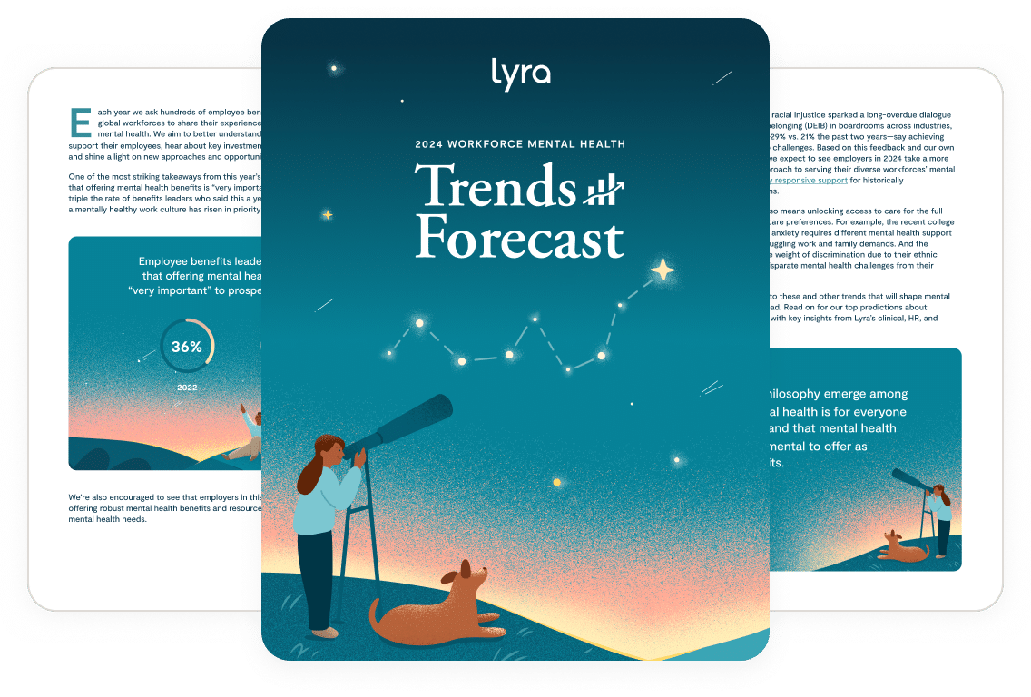 Lyra Health surveyed 250 benefits leaders across the U.S. to identify trends in mental health benefits for 2024. The most striking takeaway from this year’s survey? 94% of respondents say offering mental health benefits is “very important” to prospective employees—nearly triple the rate of benefits leaders who said this a year earlier (36%). Read the report to uncover our top 6 predictions for workforce mental health in 2024, including: