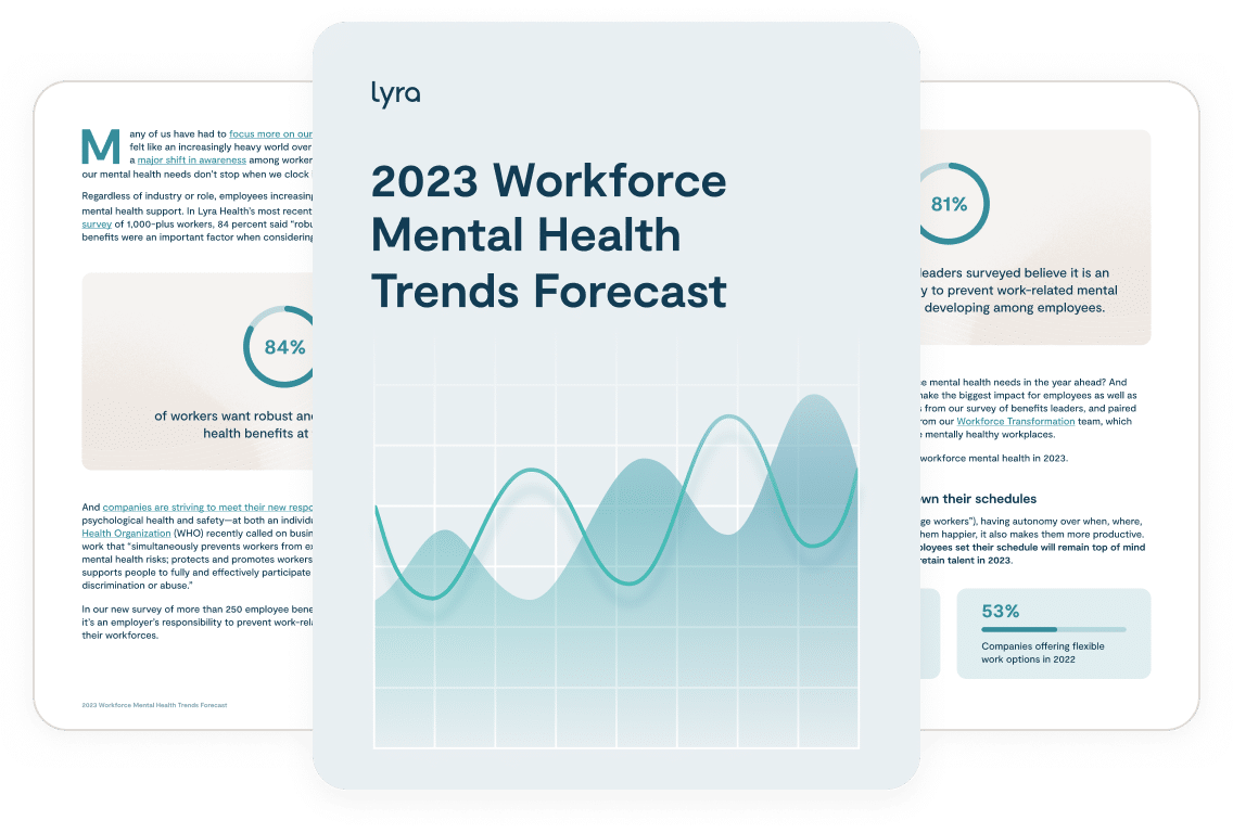 Lyra Health surveyed over 250 benefits leaders and gathered recommendations from our Workforce Transformation team, which works with employers to build cultures of mental wellness. Get the guide for our top predictions about workforce mental health in 2023 including: