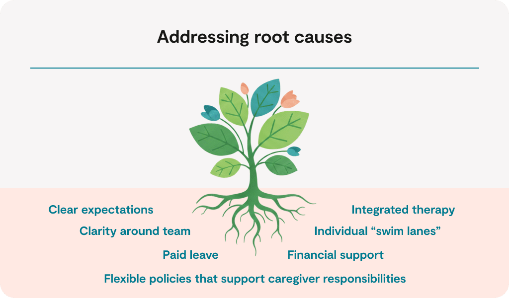 While all of these solutions are useful, they’re not enough by themselves. This approach manages surface-level challenges without addressing what’s causing them—whether that’s work-related stressors that call for systemic solutions, or personal issues like caregiver burden or childcare needs that go beyond what individual therapy can address. Like giving cough drops to someone with strep throat, they might temporarily ease pain, but they won’t make the underlying infection go away.