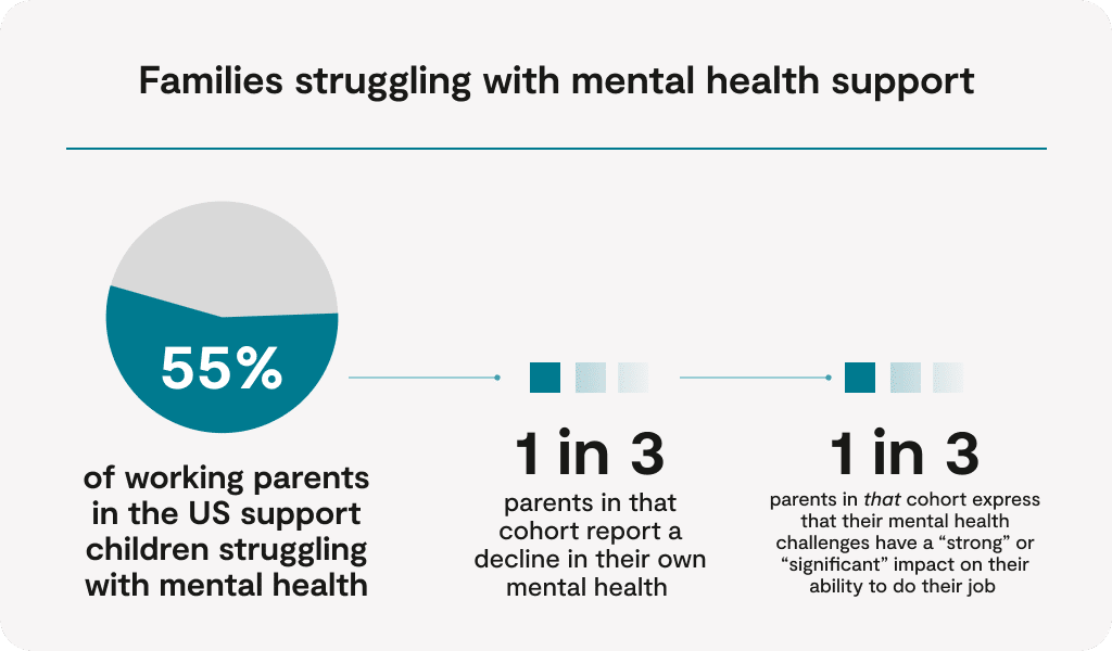 More than half of working parents in the US support children struggling with mental health. One in three parents in this situation report a decline in their own mental health, with many of them expressing that their mental health challenges have a “strong” or “significant” impact on their ability to do their job.