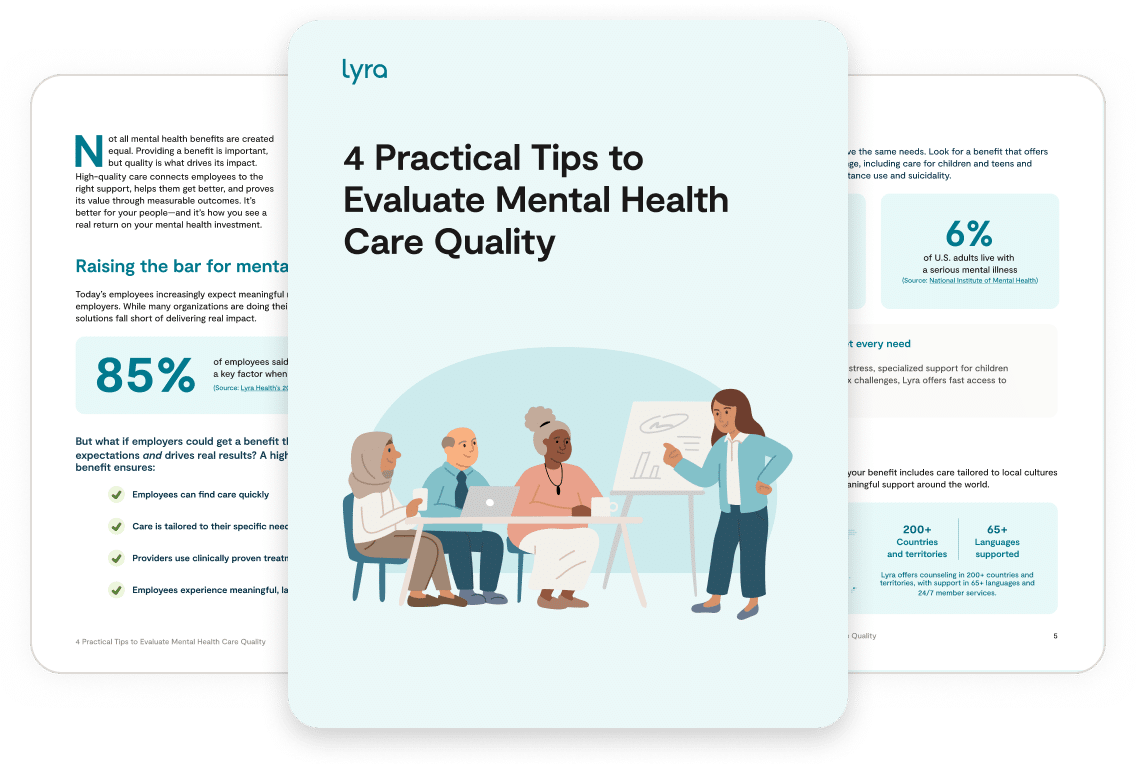 Today’s employees increasingly expect meaningful mental health support from their employers—and 85% say these benefits are a major factor when choosing where to work, according to a recent Lyra survey. Discover four practical tips for spotting high-quality care in a mental health benefit, including: