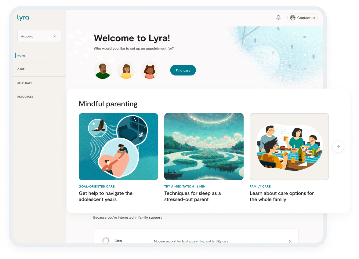 Not enough employees are getting the care they need. Average wait for a mental health visit is 21 days—for a child it’s 7.5 weeks. With Lyra, members can sign up and begin their journey to feeling better in just a few clicks.