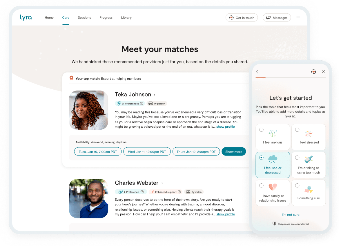 With Lyra, your members receive support beyond 1-1 sessions with their provider, as they build and practice resiliency skills to meet the challenges of their daily lives. With 24/7 access to personalized digital exercises and direct messaging with their provider, members get better faster.