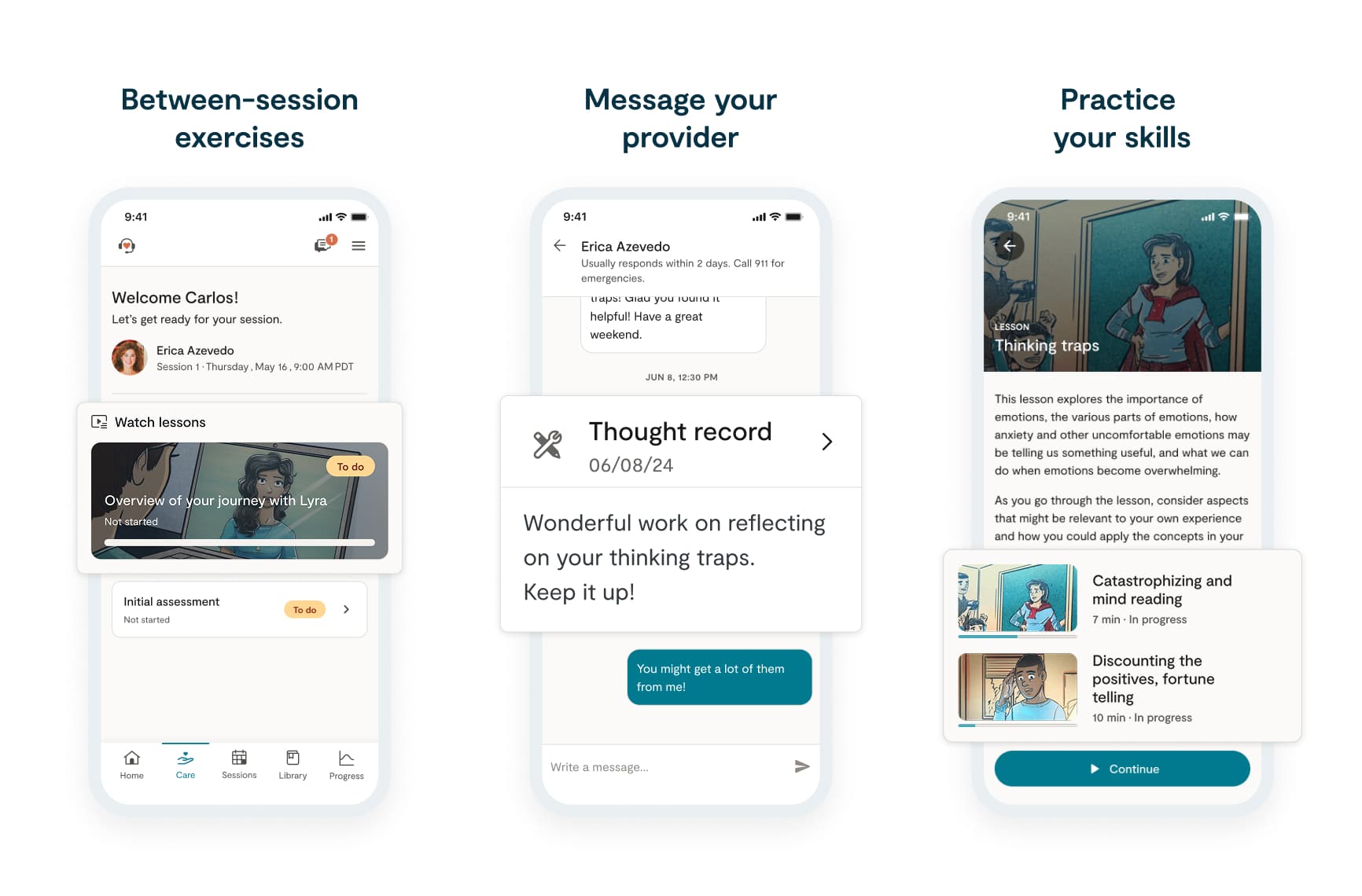 Our interactive content is enhanced by personalization, expert feedback, and real-time support—elements missing from self-serve apps and other mental health benefits. Lyra Care providers monitor progress in real time, offering feedback throughout the week that strengthens the effectiveness of therapy. Research shows that provider feedback can boost clinical progress for up to two weeks—an impact that’s only possible with the Lyra Care model.