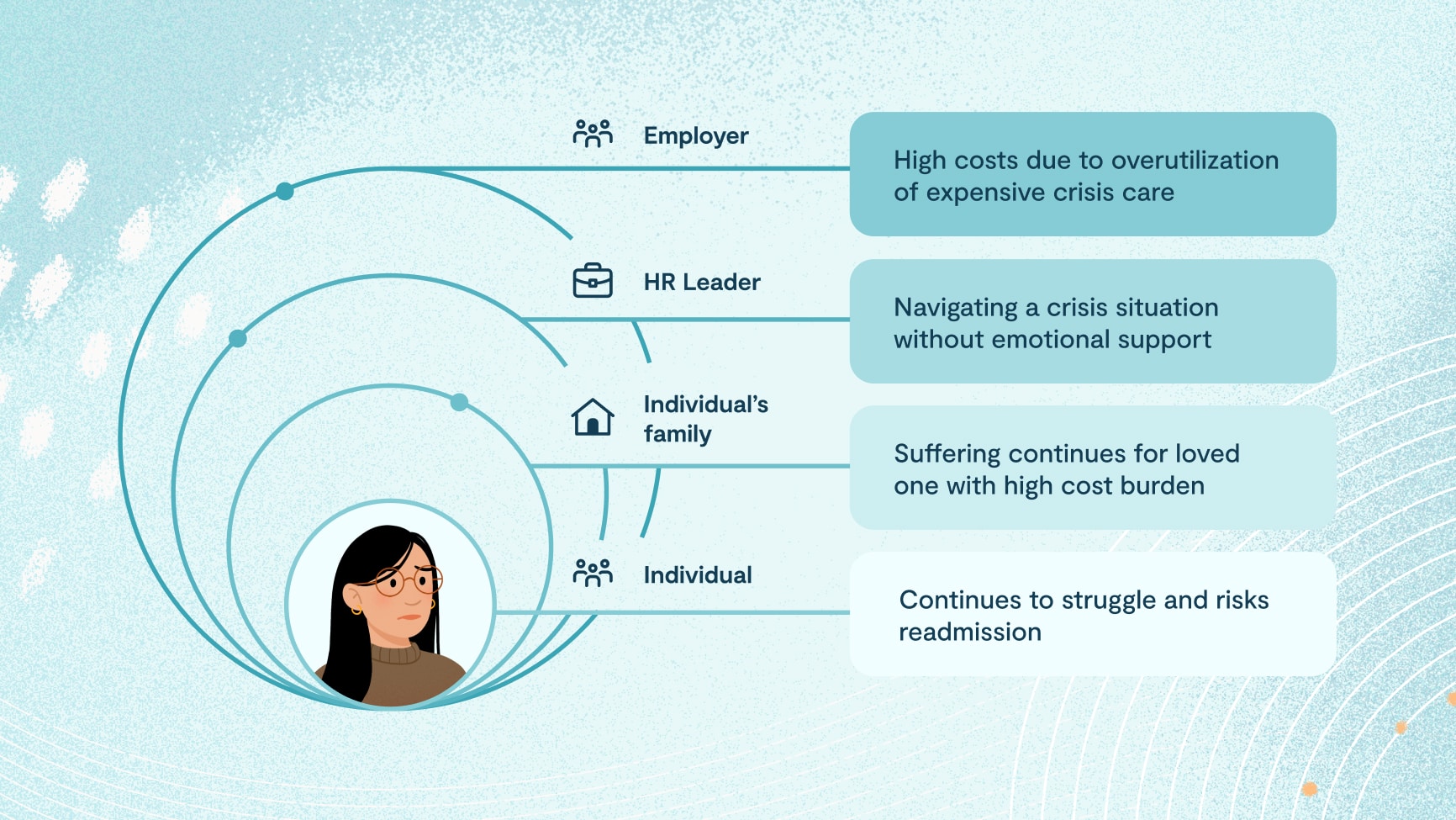 The challenges of having a complex mental health issue are deep and pervasive. It can be hard to go to work, attend school, or live your life. Some patients I’ve worked with are lucky and have a loved one who makes it their full-time job to manage the recovery. This is a lot to ask of someone who is not an expert and needs to also care for themselves, given the impact of the stress. This effect can also extend to the workplace, where the economic toll of complex mental health needs alone is $300 billion annually.